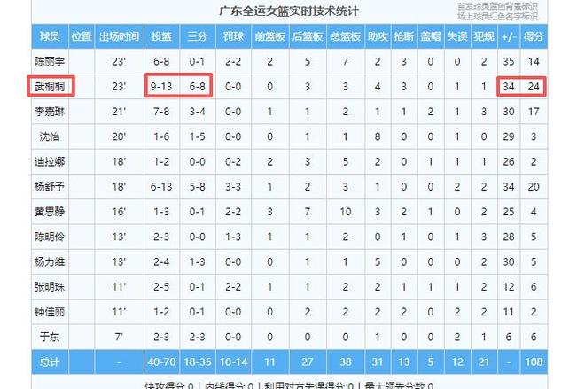 本场比赛广东队12人上场,全部得分,其中四人得分上双。杨舒予表现非常积极,第一节前五个三分全部命中,单节轰下18分。值得一提的是,老国手,刚刚从山西转会来广东队的武桐桐表现也非常抢眼,她打了23分钟13投9中,其中三分8中6,还贡献了4个助攻,拿到全场最高的24分,在场赢34分。他还拿到球队三个第一,命中三分球最多,三分命中率最高,得分最高。她的风头完全盖过当红国手杨力维和杨舒予,是一位值得依赖的控卫。