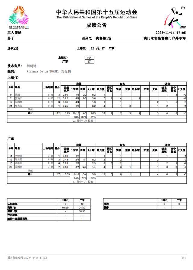 随后,上海队逐步占据上风,保持比分上的领先。当然,分差一直都不大。i随着郭瀚宇扔进2分,最终,上海队以22-17击败广东队,率先打进三人男篮4强。