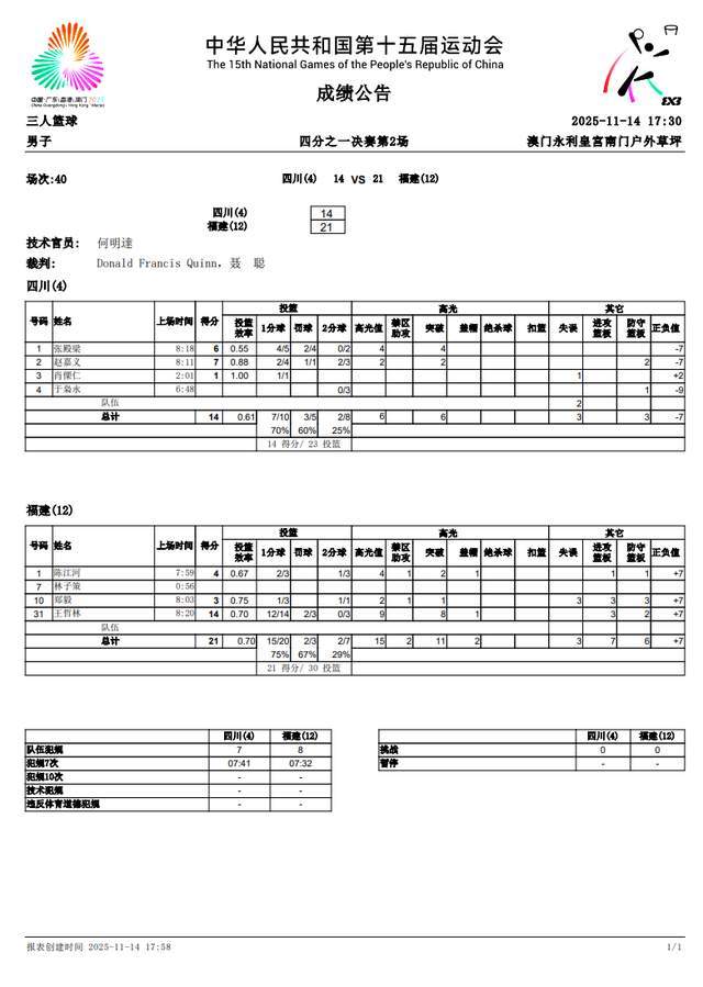 两队开局打得十分胶着,从1比1到2比2,再到3比3、4比4之后,福建队开始开局上风。王哲林手感火热,他多次强突篮下打进,直接扛起福建队。随着王哲林在篮下抢到进攻篮板,然后上篮得手,福建队以21-14淘汰四川队,顺利晋级4强,与上海队会师。